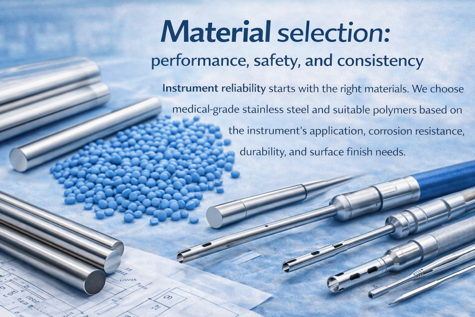 Instrument reliability starts with the right materials. We choose medical-grade stainless steel and suitable polymers based on the instrument’s application, corrosion resistance, durability, and surface finish needs.