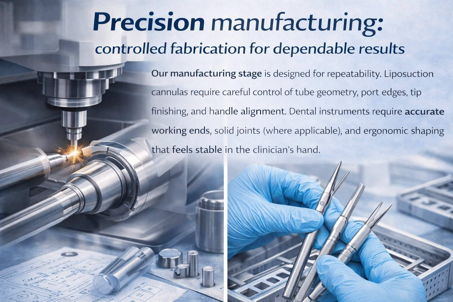 Our manufacturing stage is designed for repeatability. Liposuction cannulas require careful control of tube geometry, port edges, tip finishing, and handle alignment. Dental instruments require accurate working ends, solid joints (where applicable), and ergonomic shaping that feels stable in the clinician’s hand.