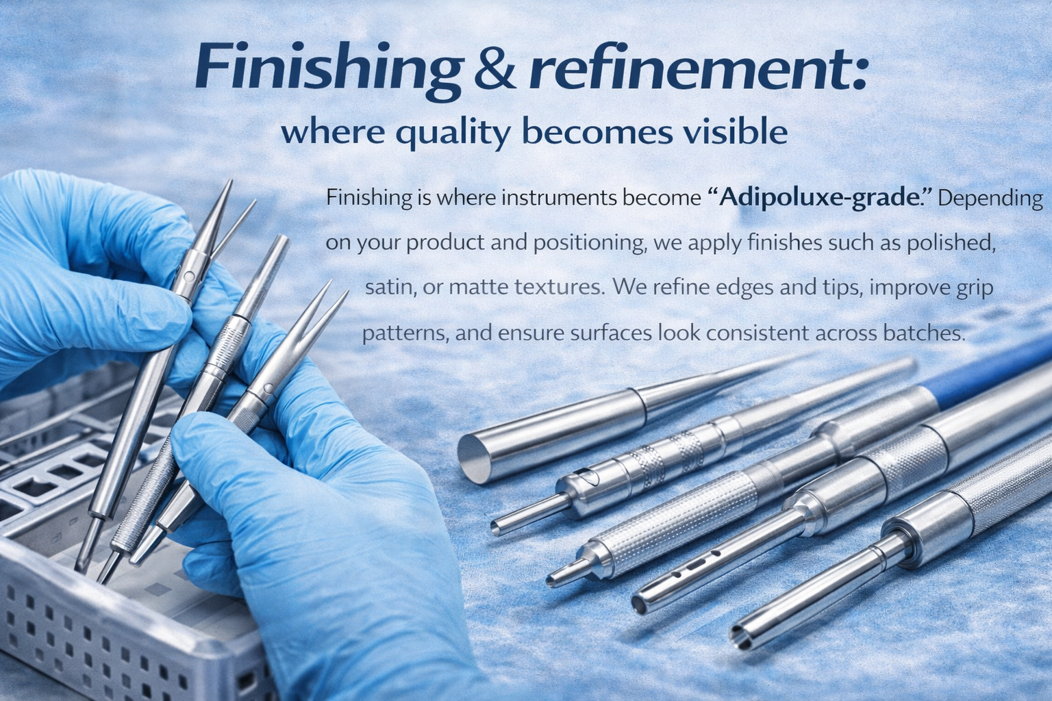 Finishing is where instruments become “Adipoluxe-grade.” Depending on your product and positioning, we apply finishes such as polished, satin, or matte textures. We refine edges and tips, improve grip patterns, and ensure surfaces look consistent across batches.