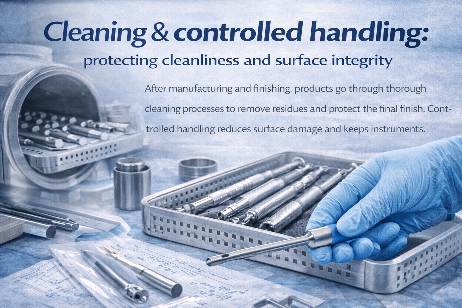 After manufacturing and finishing, products go through thorough cleaning processes to remove residues and protect the final finish. Controlled handling reduces surface damage and keeps instruments presentation-ready. Where required, we apply material-appropriate treatments (such as passivation methods suitable for stainless steel) to support corrosion resistance and long-term stability.