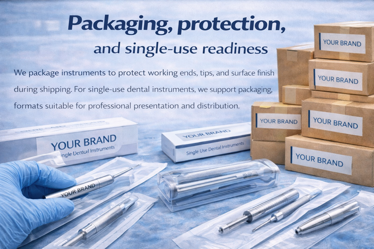 We package instruments to protect working ends, tips, and surface finish during shipping. For single-use dental instruments, we support packaging formats suitable for professional presentation and distribution. Label layout, barcodes, and carton branding can be aligned with your market needs. If you are building a full single-use line, we also help you standardize packaging across multiple SKUs for a clean retail or distributor-ready catalog.